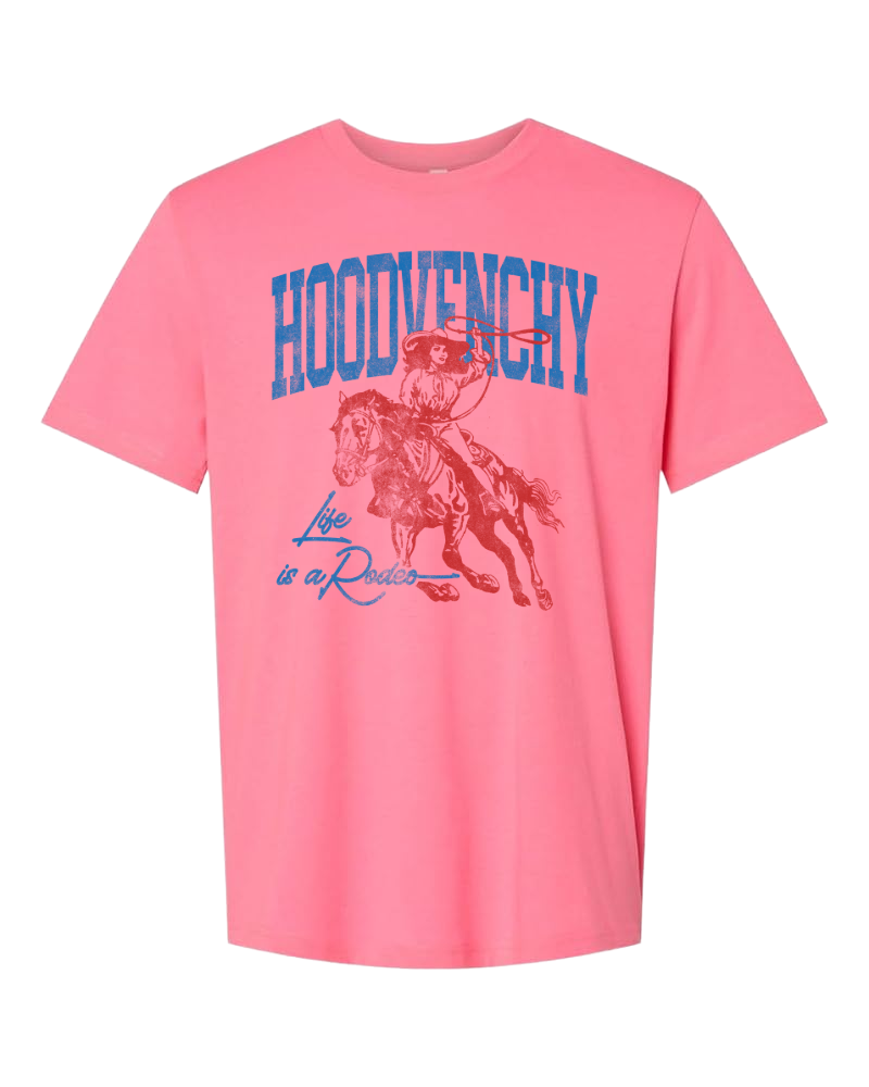 Pink Rodeo tee featuring a cowboy graphic and the phrase “Life is a Rodeo.” Designed in support of Breast Cancer Awareness with a bold, stylish Southern touch.